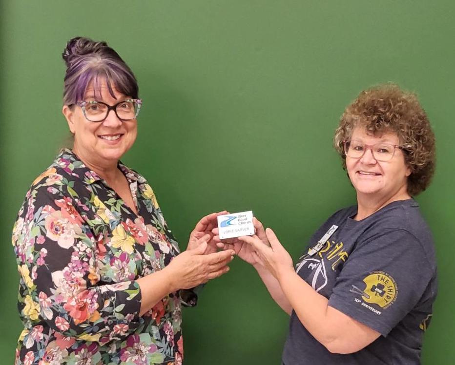 Welcoming a new member is always exciting, and at last night's rehearsal we did it twice! Monika Scott and Lorie Garver auditioned several weeks ago, and Membership Coordinator Debbie Strasser presented them with their chorus name badges. Monika joins our tenor section, and Lorie is our newest lead. Welcome Monika & Lorie!